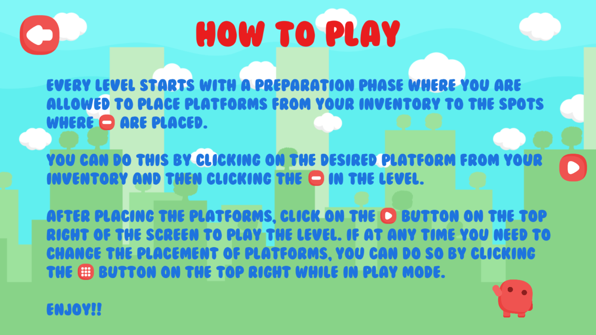 Morphy is a puzzle-platformer game where the player is given an inventory of platforms at the start of the level which he/she is allowed to place at certain pre-defined locations of the level. After placing these platforms, the player has to play through the level and try and get Morphy to his goal. If the player fails to do so, he/she can change the placements of the platforms according to his new strategy and try again. As of now, there are 10 Levels only in the game due to this being a solo project where I did all the Game Design, Level Design and Programming in Unity myself. I have used art assets from Bayat Games which were completely free to use from the Unity Asset Store. Through this project I got to learn a lot in all departments, i.e. Game Design, Level Design and Programming and am very happy with the development of skills on a personal level. I am very happy with the outcome of this project and would like to thank all my friends and family who playtested the game and gave me so much valuable feedback to work from. Without them, this game would not have turned out the way it has right now.